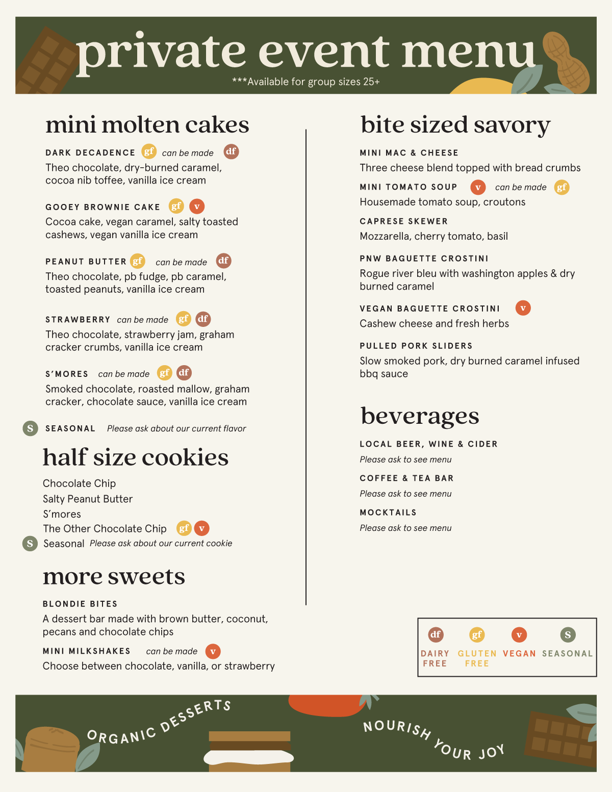 A custom menu showcasing our commitment to what hot cakes is all about: local, high quality, organic ingredients with plenty of allergen friendly options. For group sizes 25+ please refer to our private event menu to the left. For smaller groups, please check out our full restaurant menu that is updated seasonally here